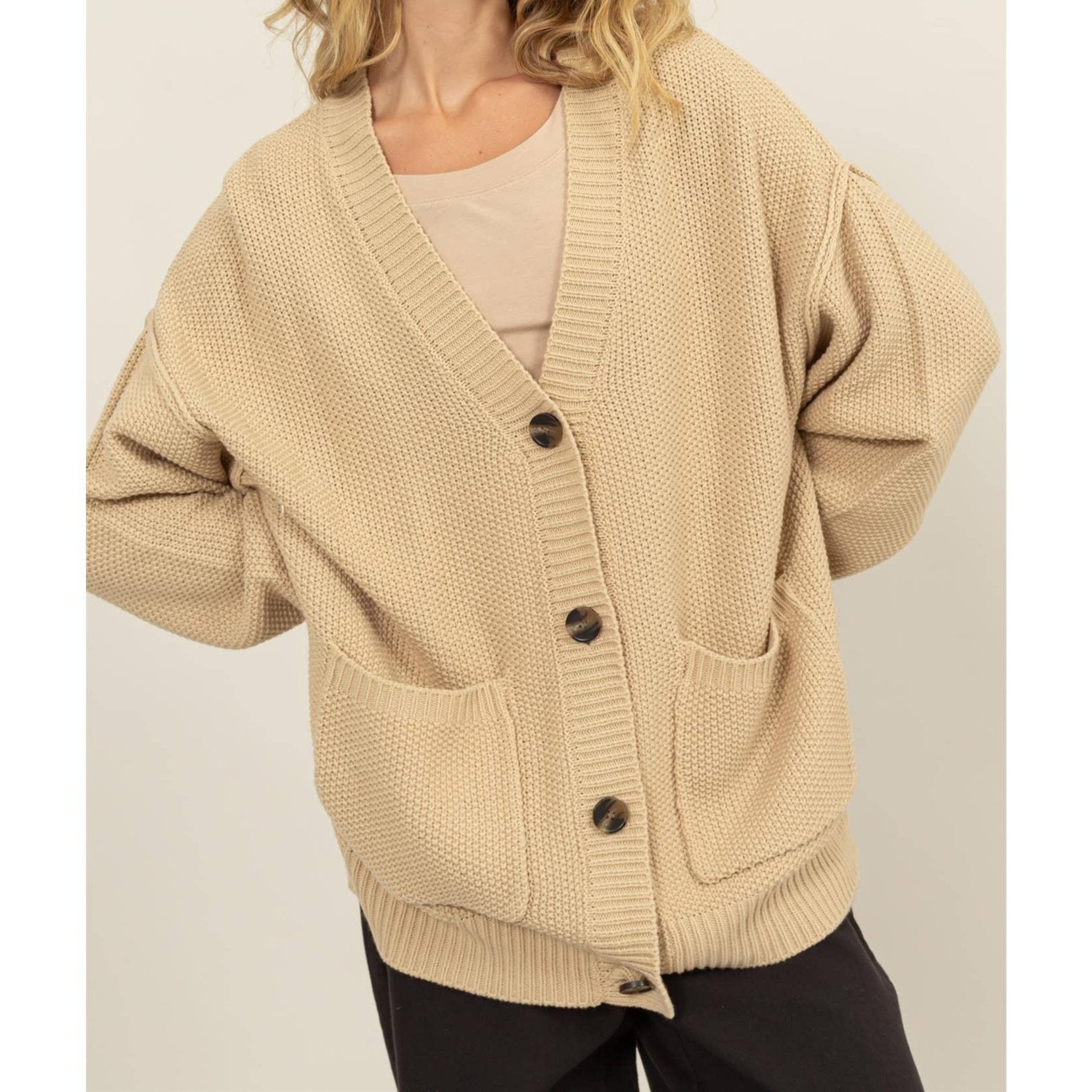 Indulge in cozy and chic fashion with this over sized button-up cardigan. Its relaxed fit and spacious front pockets provide both practicality and style. The thick knit texture offers warmth and comfort, while the large buttons elevate the design.